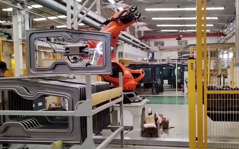 視覺(jué)引導(dǎo)機(jī)械手抓取汽車(chē)門(mén)框用3D定位架子的XY和角度還有門(mén)板的高度,用2D視覺(jué)系統(tǒng)定位門(mén)板的抓取位置,引導(dǎo)機(jī)械臂抓取工程車(chē)門(mén)板。